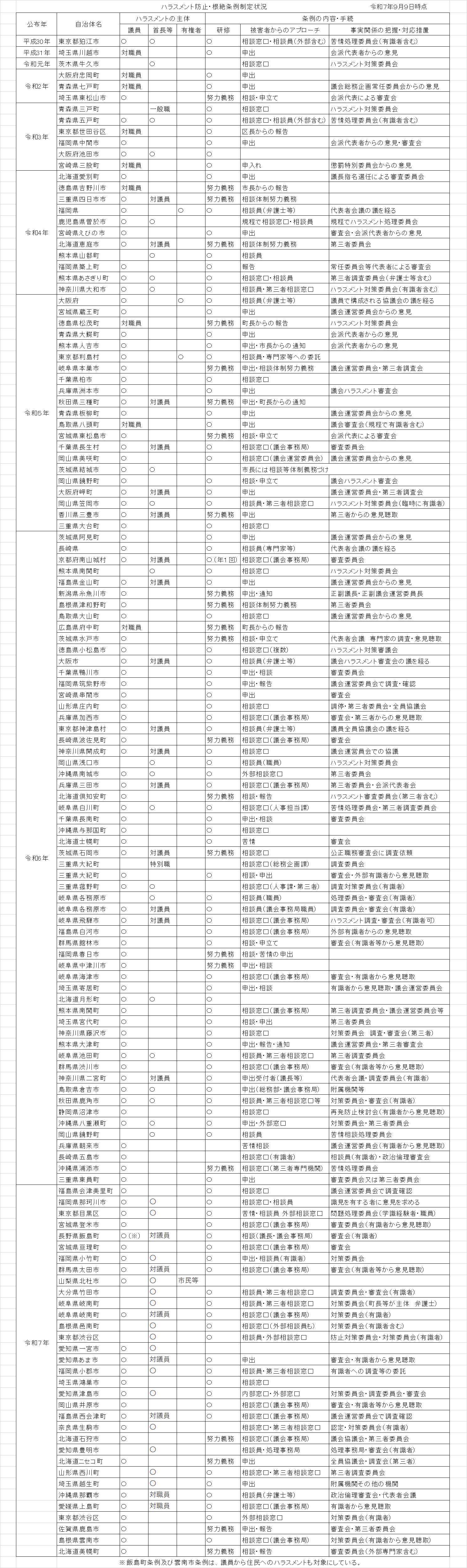 〇 自治体職員のハラスメントの防止や根絶については、通常、自治体の要綱や規程等において定められており、また、議員については、政治倫理条例で規定する政治倫理基準において定めているものもある。しかし、首長等や議員のハラスメントの防止等に関する特化条例を制定している自治体がある。令和7年9月9日時点で制定されているものとして、次の129団体の135条例が確認できる。すなわち、